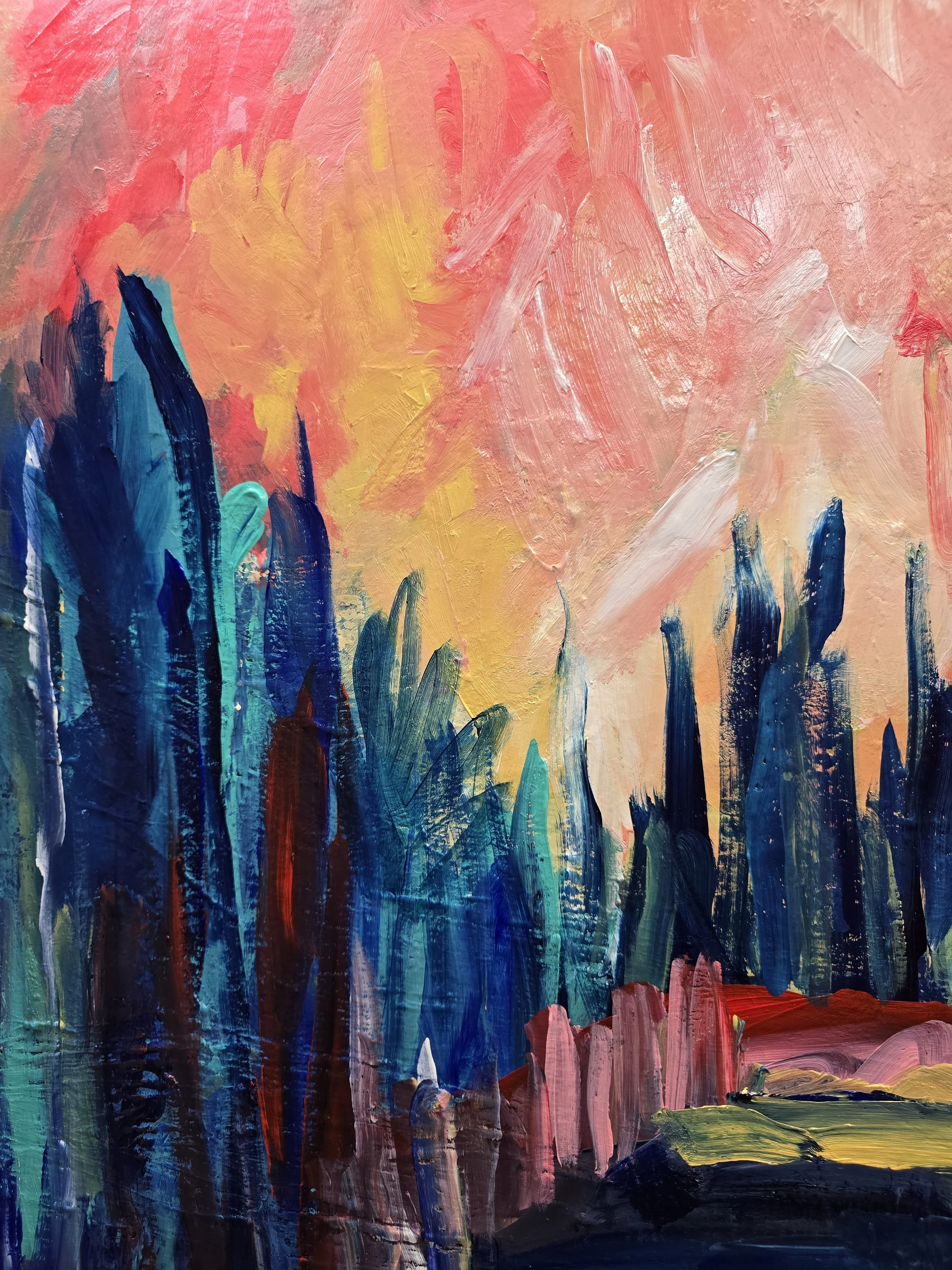 Making art makes me happy. I love colour, texture, and movement, and use a variety of media to build vibrant, unique, and bold pieces of art. I’m inspired by nature, travels, experience, and sometimes just the materials themselves. My pieces are most often abstract explorations of natural spaces, informed by memory and emotion rather than a strict depiction, with a recurrent theme of awe and solitude. And sometimes I just play until the subject reveals itself.